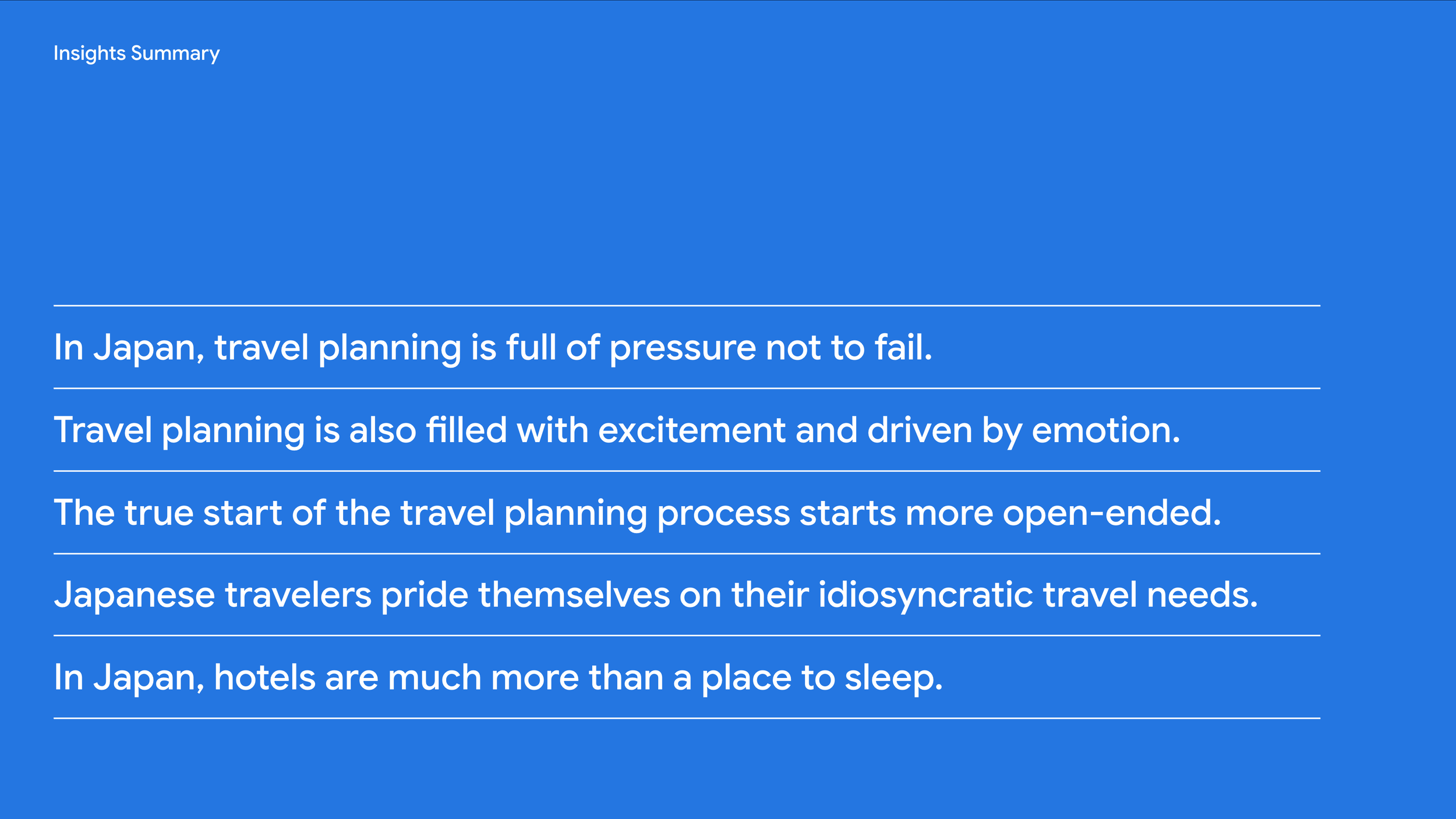 Our hypothesis was that something was driving this from a cultural perspective and we might uncover new opportunities if we could unlock some of that—what’s not being said outright. The UX here for Japanese Online Travel Agencies answer a need, but that doesn’t mean it has to be Google’s answer. If we can understand the needs driving why these products are what they are in terms of UX, Google can design for them, but in Googly ways. Before creating the ‘what’, we had to figure out the ‘why’.
