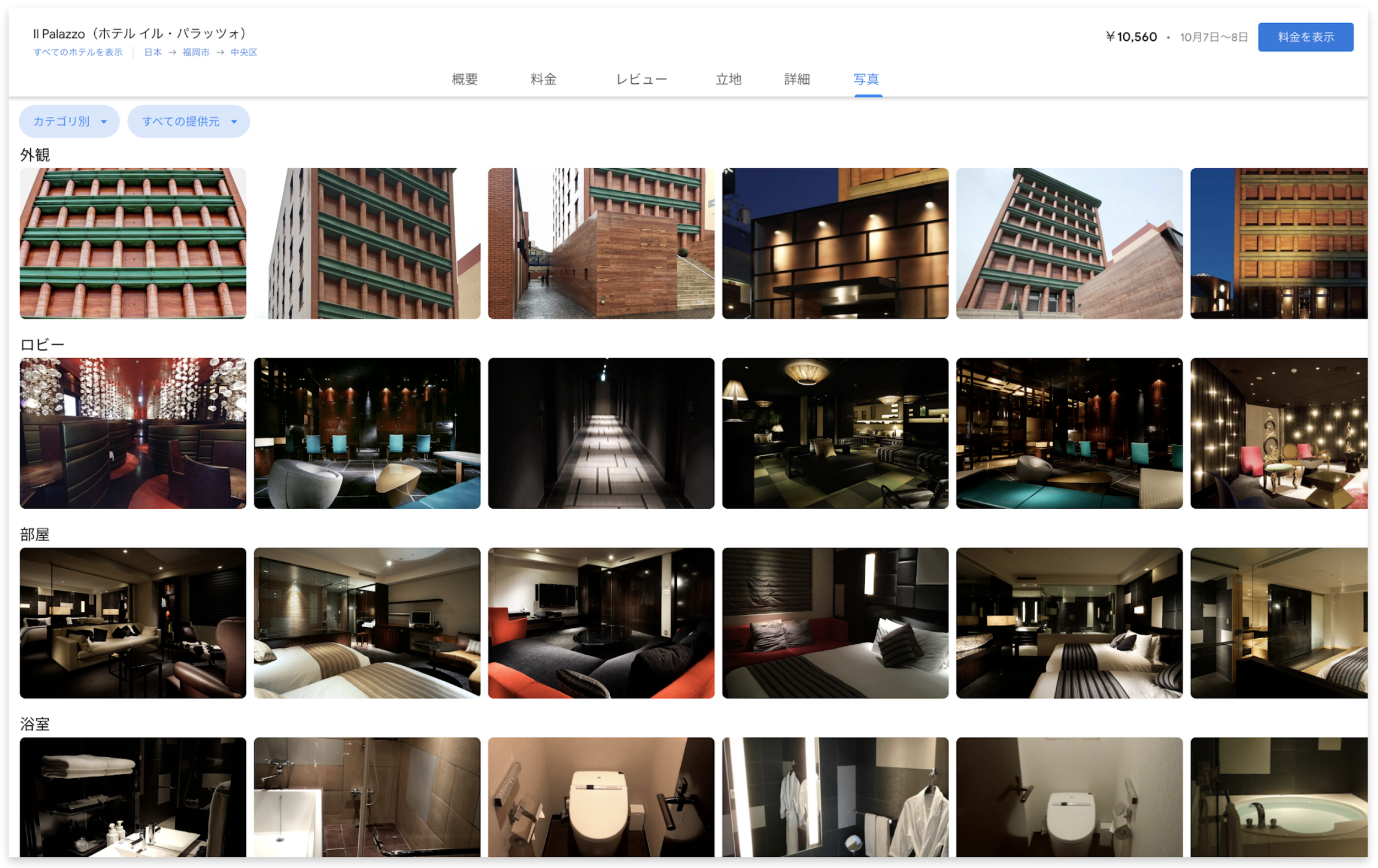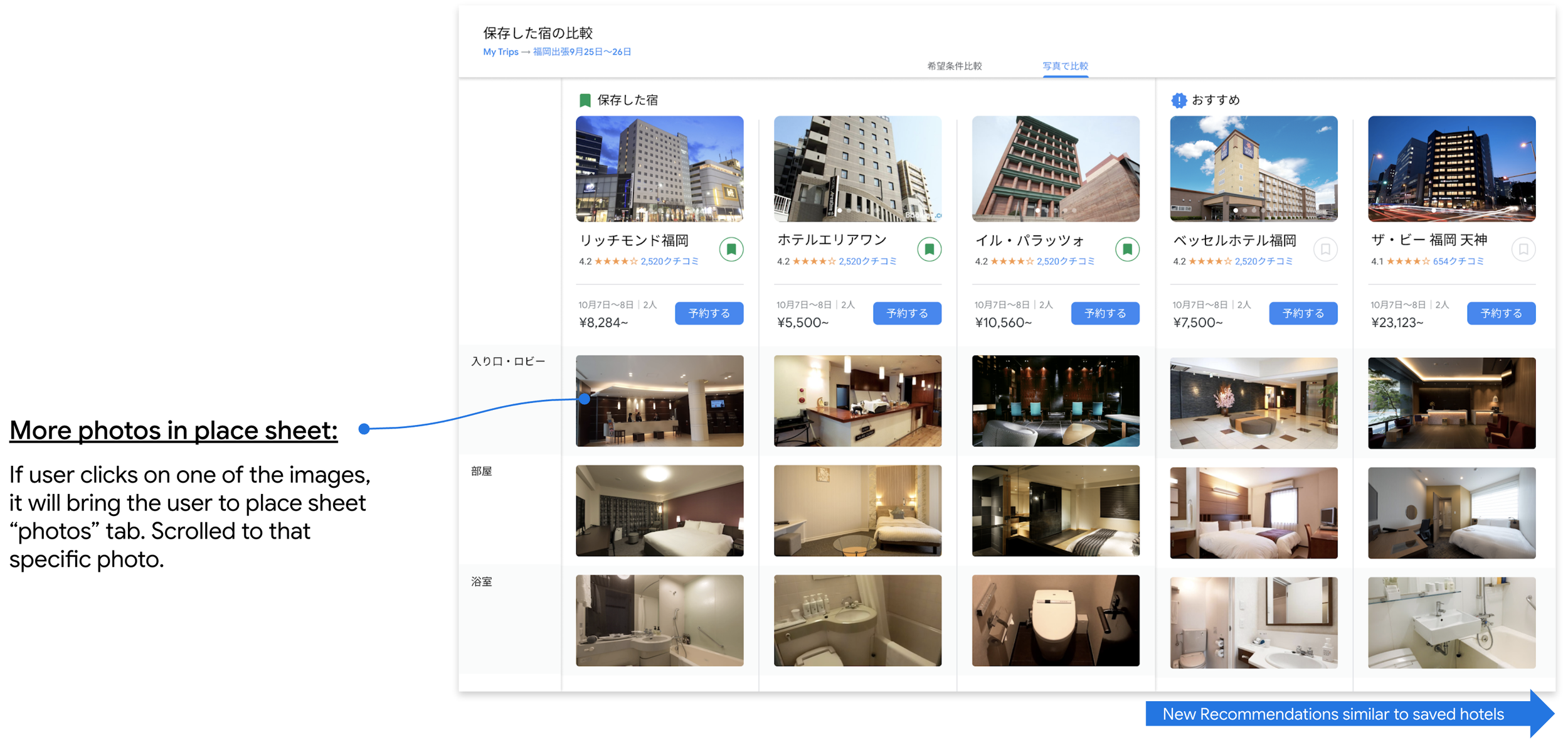 When comparing properties, users could even see photos of different categories for each hotel. For example, here our friend Ryo can visually see which toilets have a dedicated room and which are next to the tub.