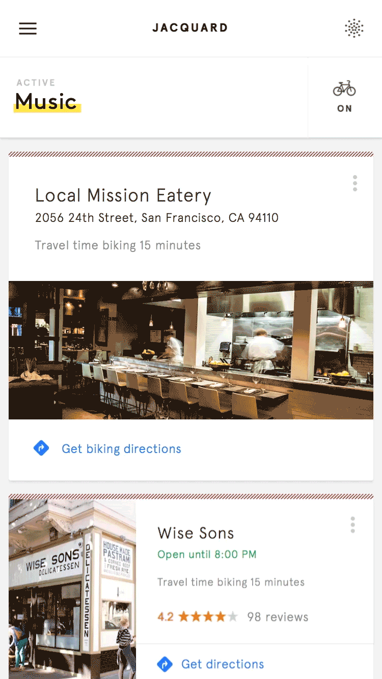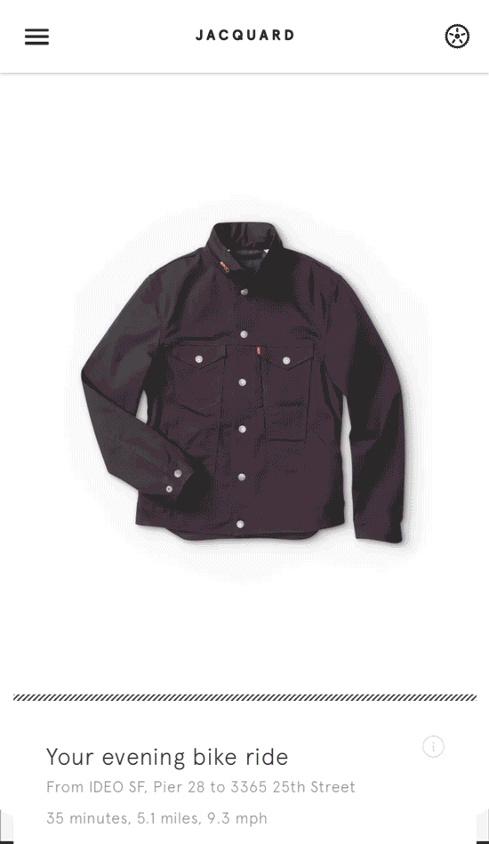 An exciting technology! But, how might we commercialize this innovation in a way that’s compelling to the end user? We spent time on the project early on, collaborating with Google engineers and Levi’s clothiers on the development of a Levi's jacket, helping craft an experience that would make the intelligent threads intuitive to wearers.