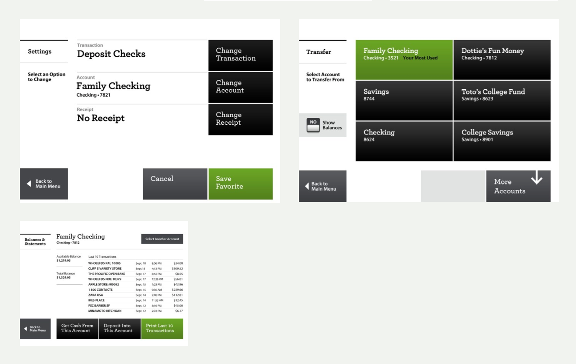 On the Main Menu the most used transactions are collapsed into two large green favorite or shortcut buttons. This allows the user to press one button to instantly execute the transactions they do the most. On other screens the most-used option is often highlighted in green and labeled “Your Most Used.” The color and label attract the user’s attention and quickly guides them to the option they are most likely to choose while not limiting them to only that option.